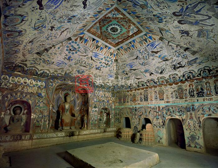 窟顶可以看到,东披上中心绘制的摩尼宝珠,这是佛教最重要的符号,两边是伏羲和女娲的组合。作为中国文化的缩影。南壁上段有一排飞天,其实是一股秀骨清像,褒衣博带的形式。这种风格肯定是从中原传入,对前期西域风格的进一步固化。敦煌的历史从汉代版图上已经是非常重要的节点。